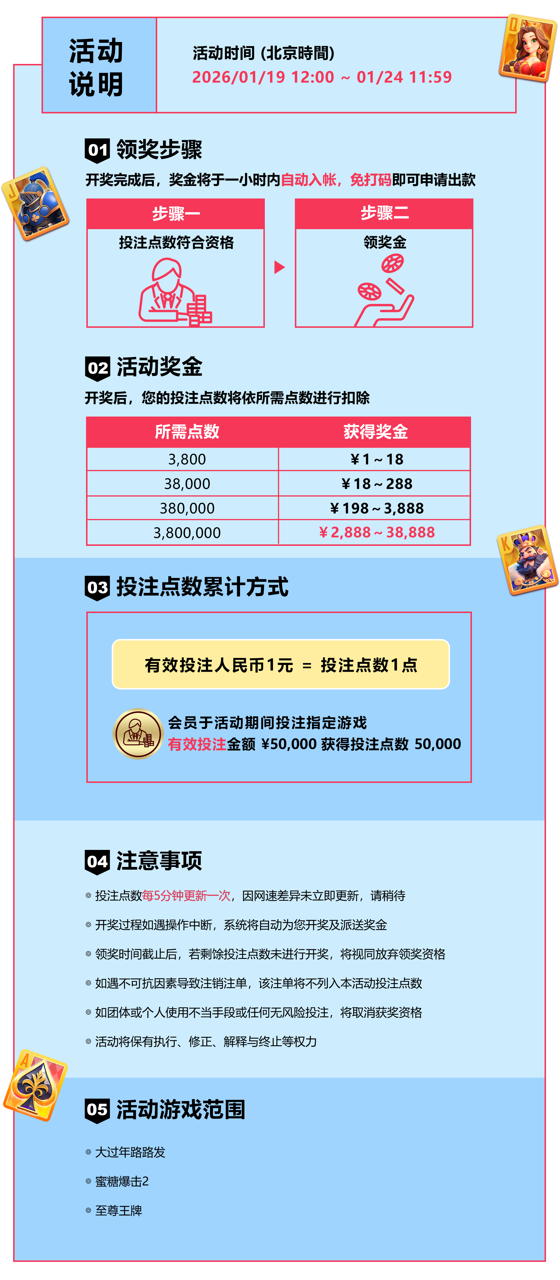 - 活动期间:2026/01/19 12:00 - 01/24 11:59 (北京时间),累积投注点数及领奖时间。