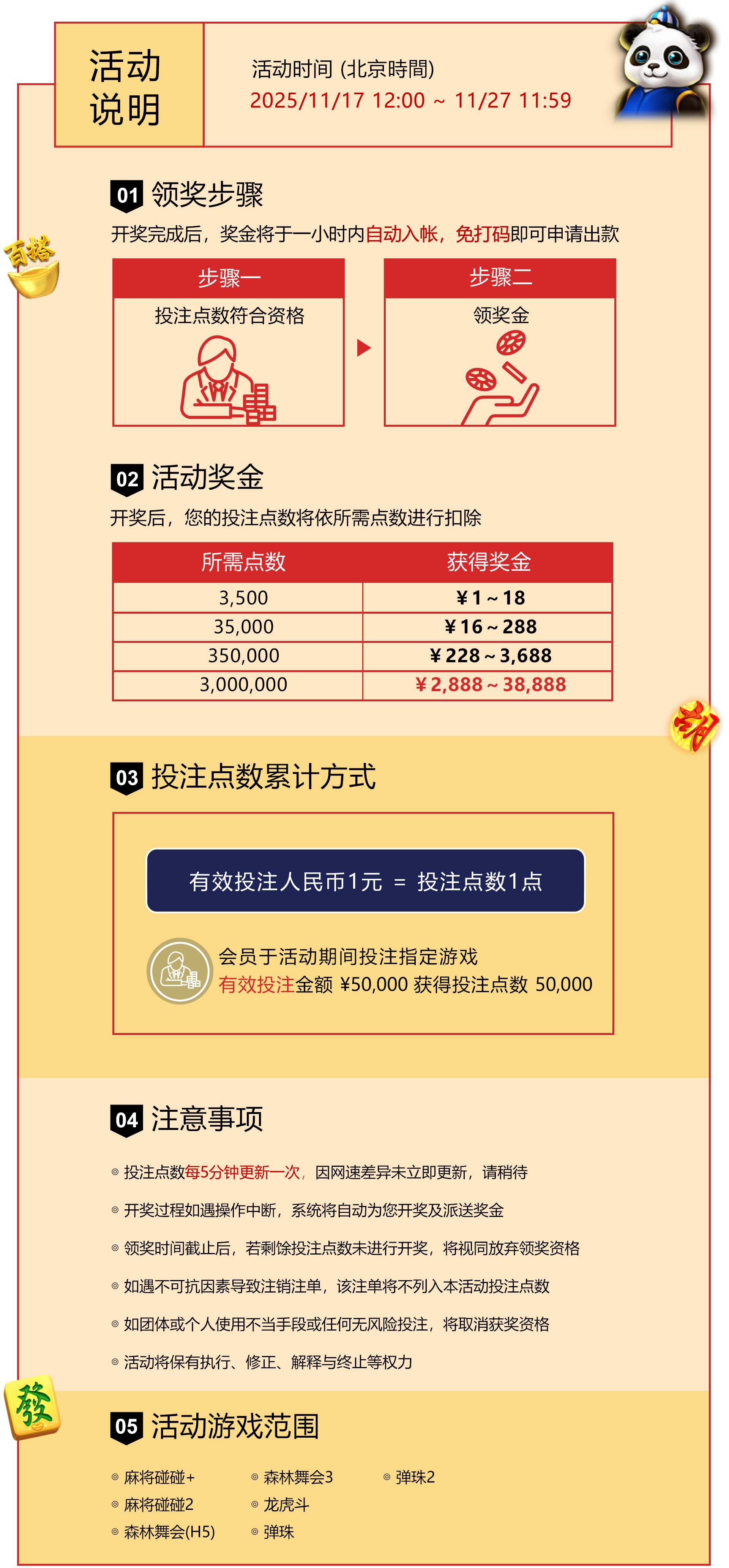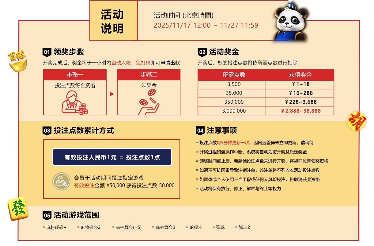 - 活动期间:2025/11/17 12:00 - 11/27 11:59 (北京时间),累计投注点数及领奖时间。